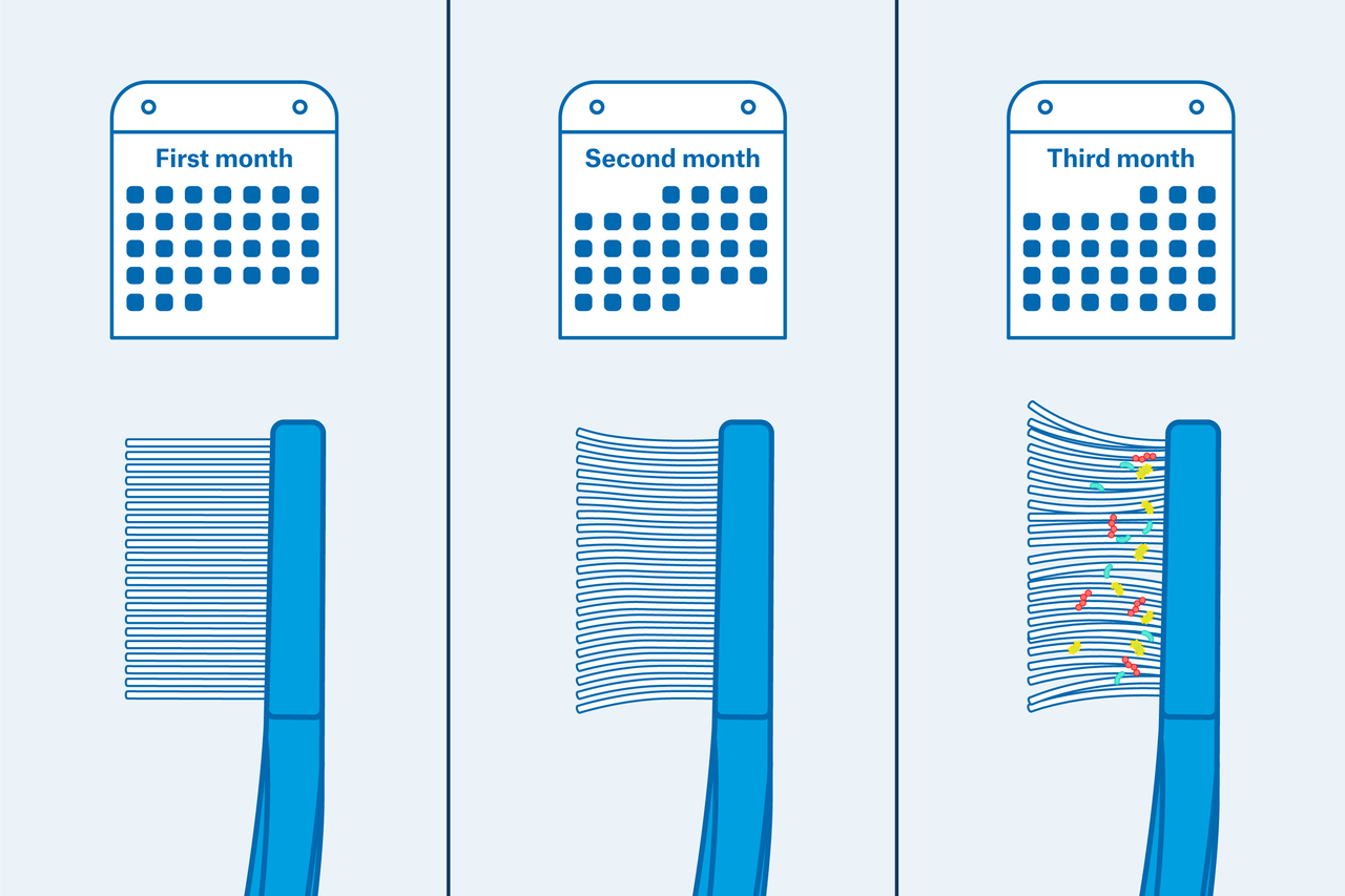 A toothbrush is a dental hygiene instrument that should be used for approximately three months, but many of us neglect to follow this simple advice. There are two important reasons why a toothbrush should be replaced regularly: firstly, as a result of mechanical wear, the bristles start to bend, leading to insufficient removal of dental plaque over time. The second reason is the rapid accumulation of bacteria, which tends to grow much faster in moist environments.
